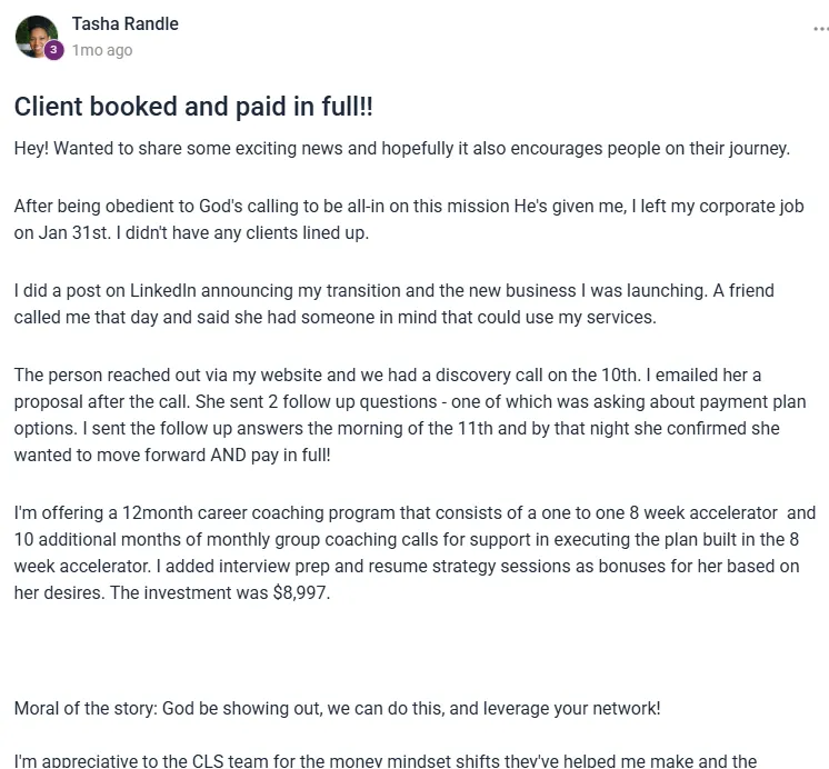 After joining the program, she finally had the structure she needed. In just 10 days, she launched her website, promoted her first offer, and enrolled four paying clients — generating $8,000 from her very first launch, all while working full-time.